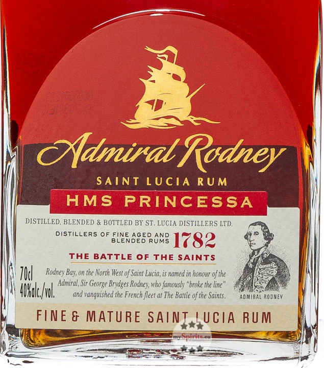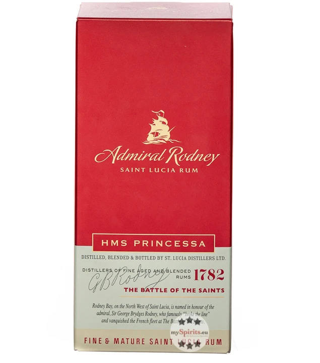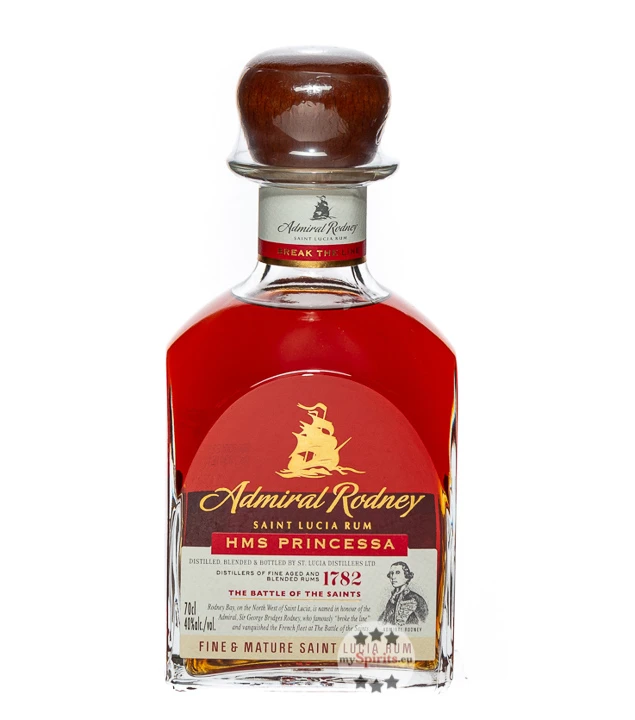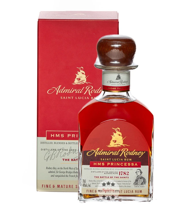 HMS Princessa Rum ist einer der drei Admiral Rodney Rums der St. Lucia Distillers, die eine Hommage an den britischen Flottenadmiral darstellen und jeweils eines der Schiffe ehren, die bei der für die Briten erfolgreiche Schlacht Battle of the Saints von 1782 im Einsatz waren. Bei HMS Princessa handelt es sich um einen Blend aus 5 bis 9 Jahre alten Rums, die in Bourbon-Fässern reiften. Damit ist er der jüngste Rum des Trios, sollte aber keineswegs unterschätzt werden. Im Glas schimmert der Rum in dunklem Mahagoni und begeistert die Nase mit einem feinen Duft von süßen Rosinen, Honig sowie einer Spur von Vanille und Tabak. Süß und trocken präsentiert er sich an Gaumen und Zunge. Zu Noten von Crème Brûlée und braunem Zucker gesellen sich würzige Nuancen von getoasteter Eiche. Abgerundet wird das Geschmackserlebnis mit einem vielschichtigen Finish, das von Eiche, Karamell und exotischen Gewürzen geprägt ist.