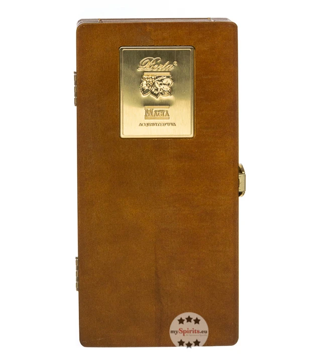 Die typisch für Berta, aufwendig gestaltete Flasche wird stilvoll in einer edlen Holzkiste geliefert.