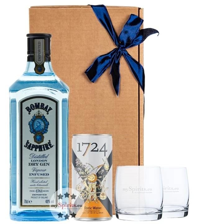 Gin Geschenkset mit Bombay Sapphire, 1724 Tonic Water und zwei Gläsern