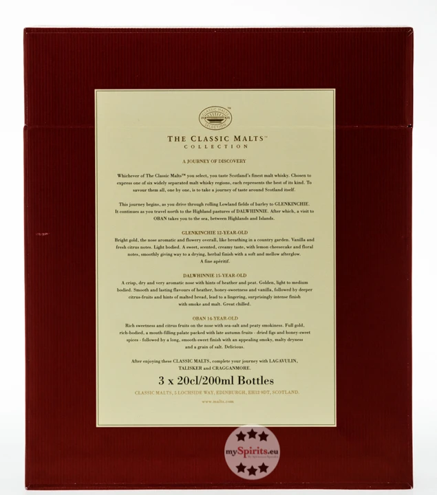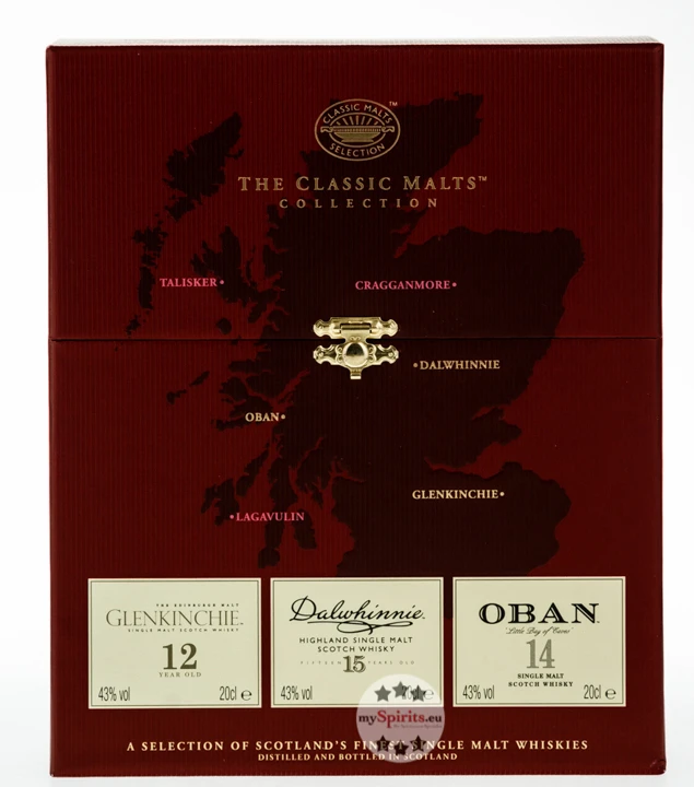 In The Classic Malts Collection Gentle finden sich drei wunderbare, sanfte Single Malt Scotch Whiskys in je einer 20 cl Flasche. Verpackt ist das Whisky-Set mit den drei Flaschen in einer schönen bordeaux-roten Schatulle. Die drei enthaltenen Whiskys vereint ihr Herkunftsland Schottland, sie sind das Aushängeschild ihrer Destillerien und überzeugen mit ihren Geschmack