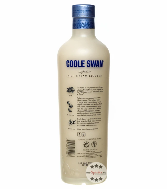 Coole Swan Liqueur ist ein wunderbar cremiger und eleganter Likör aus feinstem Irish Single Malt Whiskey, echter belgischer, weißer Schokolade und frischer Sahne. Cremig mit feinem Geschmack nach weißer Schokolade und dennoch nicht übermäßig süß oder gar übersättigend, schmeckt Coole Swan Irish Cream Liqueur wunderbar pur, auf Eis und auch als besondere Zutat für Cocktails. Auch die leicht würzigen, süß-nussigen Nuancen des Whiskeys kommen bei diesem Schokolade-Creme-Likör wunderbar zur Geltung und ergänzen die frische Süße der Schokolade und das Zusammenspiel der weiteren Zutaten. Die angeraute Flasche mit einer speziellen lichtundurchlässigen Farbbeschichtung wird in kleinen Manufakturen in Slowenien und Polen hergestellt und erinnert im Design an alte viktorianische Milchflaschen – eine Referenz an die Herstellung des Likörs mit frischer, cremiger Sahne.