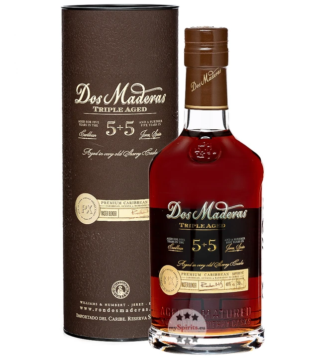 „Dos Maderas“ bedeutet auf Deutsch „zwei Hölzer“. Für Dos Maderas PX 5 + 5 Jahre scheint allerdings die Zahl 3 eine besondere Rolle zu spielen, denn genaugenommen lagert der Blend in drei Fasstypen und darf drei Länder sein Zuhause nennen: Die Destillate für den Blend werden im südamerikanischen Guyana und auf Barbados in der Karibik hergestellt. Dort reifen sie im tropischen Klima in ehemaligen Bourbon-Fässern. Anschließend wird der Spirit Drink nach Andalusien verschifft, wo im Traditionsunternehmen Bodegas Williams & Humbert in Jerez, der Heimat des Sherry, die Nachreifung in Sherry-Fässern im Solera-Verfahren stattfindet. Zunächst reift er drei Jahre in Palo-Corto-Sherryfässern (Don Cortados) und schließlich zwei weitere Jahre in Pedro-Ximénez-Fässern (Don Guido). Letzteres erklärt auch, wofür das Kürzel PX im Namen des Spirit Drinks auf Rum-Basis steht. Das Ergebnis dieses aufwendigen Herstellungs- und Reifeprozesses überzeugt nicht nur Rum-Kenner, sondern auch Liebhaber eines guten Sherrys.