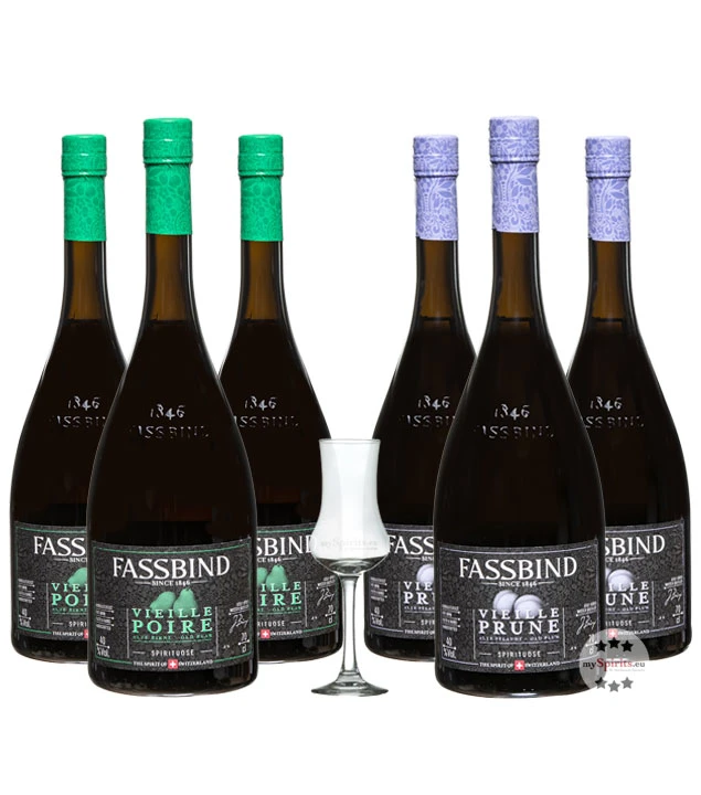 Dieses Sechserpack enthält je drei Flaschen von Fassbinds Alte Birne – Vieille Poire und Alte Pflaume – Vieille Prune, sowie den mySpirits Schnapskelch. Die hochwertigen Destillate aus der Schweiz reiften in Fässern aus Eichenholz.