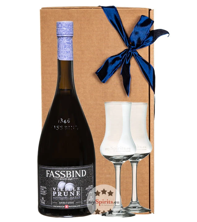 Schenken Sie die im Holzfass gereifte Vieille Prune von Fassbind. Im Set mit zwei mySpirits Kelchgläsern in einer schönen Deko-Schachtel verpackt und mit einer Schleife verschlossen – perfekt für Genießer der schweizer Obst-Destillate von Fassbind.