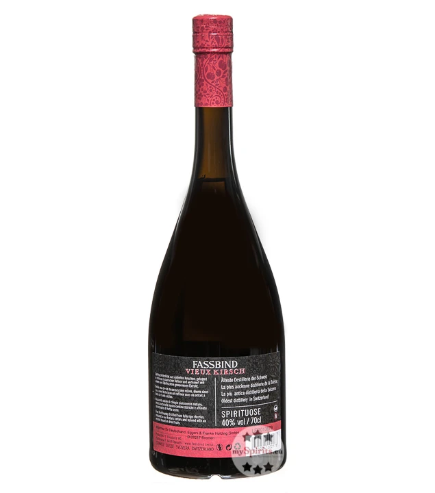 Fassbind Vieille Cerise entsteht aus besten Kirschen ausgesuchter Anbaugebiete in der Zentralschweiz und im Schwarzbubenland. Nach der Destillation im Eichenholzfass gereift, erhält Vieille Cerise durch die hausgemachte Dosage ihre fein-fruchtige Süße. Sie unterstützt den mild-geschmeidigen Charakter und harmoniert wunderbar mit den Holz- und Mandelnoten der Alten Kirsche.