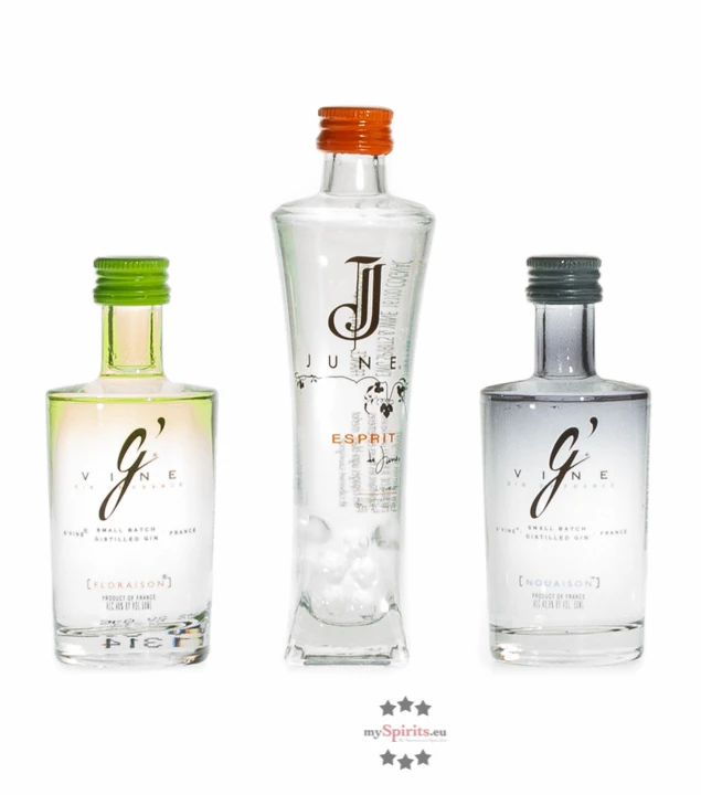 Eine wahre Besonderheit der G’Vine Produkte ist die Essenz der Weinblüte. Diese wird während der Blütezeit von Hand gepflückt und gibt den G’Vine Ginsorten ein wunderbar blumiges Aroma. Zudem werden die Gins der französischen Destillerie mit Traubendestillat hergestellt, wohingegen Gins üblicherweise mit Getreidealkohol zubereitet werden. Auch hier kommt der traubig-sanfte Geschmack des Weins zum Vorschein. Im G’Vine Flower Set, der Geschenkbox mit drei Miniaturen zum Probieren und Mixen, sind zwei verschiedene Gin-Sorten und ein sommerlicher Weinblütenlikör enthalten. G’Vine Floraison besticht mit einer sehr fruchtigen Note und bringt die Blüte des Weins wunderbar zur Geltung. Ideal im Gin Tonic. G’Vine Nouaison ist die stärkere, würzige Gin-Sorte von G’Vine und eignet sich hervorragend als intensiver Kontrast zu Cocktailvariationen. Hinzu kommt im Set noch der wunderbar frische Weinblütenlikör Esprit de June, der die Essenz eines warmen Junitages in ein Fläschchen bringt.