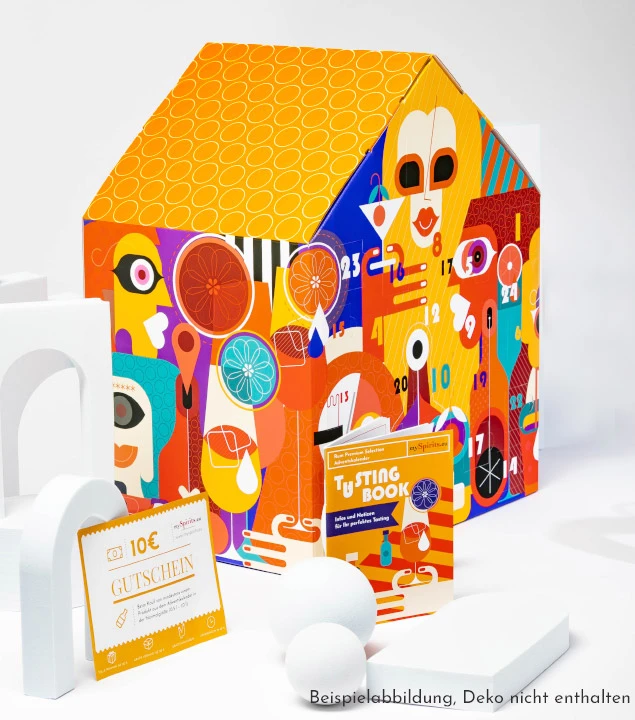 Für die farbenfrohe Art Edition des Premium Selection Gin Adventskalenders hat der Grafik-Künstler Dan Jazzia aus Moldau das Design des stabilen und formschönen Gehäuses exklusiv für mySpirits gestaltet. Bei gleichem Inhalt ist der Gin Adventskalender Premium Selection auch in einer mit winterlich-weihnachtlichen Motiven geschmückten Christmas Edition erhältlich.
