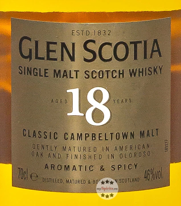 Glen Scotia 18 ist der „Luxus“-Malt unter den Abfüllungen der Traditions-Brennerei aus Schottland. Dank der langen Reifezeit lässt er sich als besonders weicher Scotch bezeichnen, der dank dem 12-monatigen Finish in Oloroso-Sherry-Fässern durch seinen blumigen Charakter auffällt. In der Nase zeigt er sich zunächst duftend und fast parfümartig, ergänzt durch eine salzige Brise und einem Anklang von Honig-Süße. Am Gaumen wechseln sich Karamell und Salz, das an einen Tag am Meer erinnert, ab, immer auf der Basis der wunderbar blumigen Nuancen. Die milde Süße lässt an Toffee denken, die aufkommende Fruchtigkeit an Zitrus. Eine feine Würze ergänzt den vielgestaltigen Eindruck.