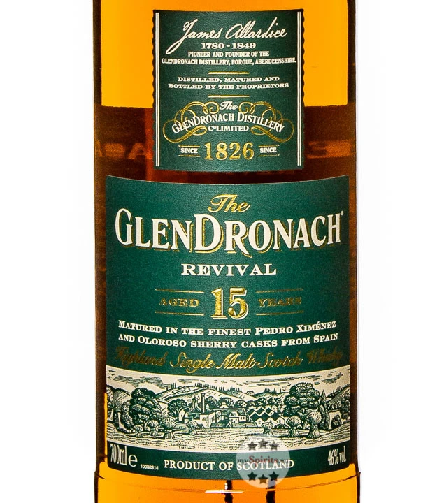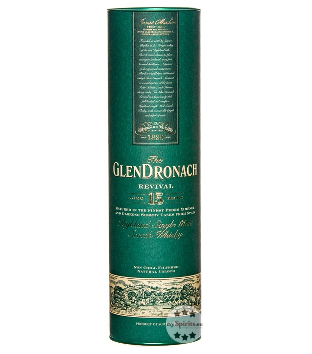 Glendronach 15 Jahre Revival ist ein naturbelassener Whisky, der mit einem Alkoholgehalt von 46 % Vol. ungefärbt und ungefiltert in die Flasche kommt. Sein komplexes Aromenspiel entfaltet er während der 15-jährigen Reifezeit in Pedro Ximénez und Oloroso Sherry-Fässern. 2018 wurde der Highland Single Malt bei der San Francisco World Spirits Competition mit Doppelgold ausgezeichnet.