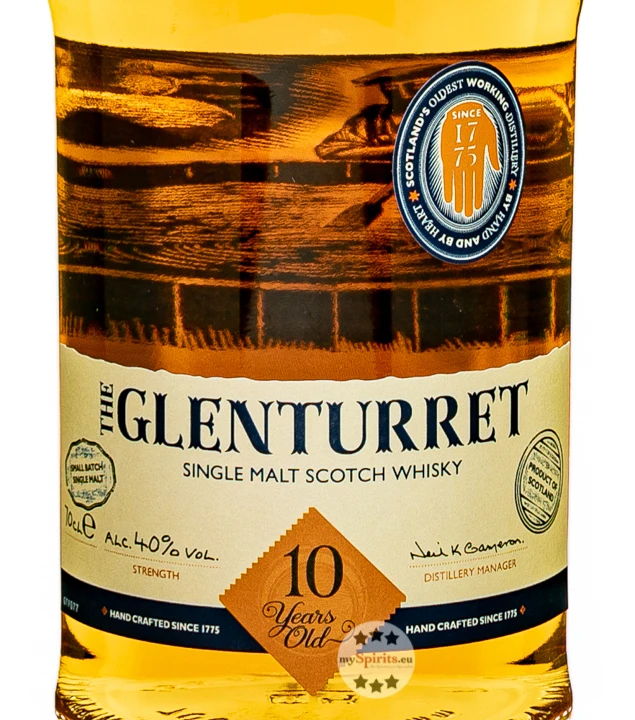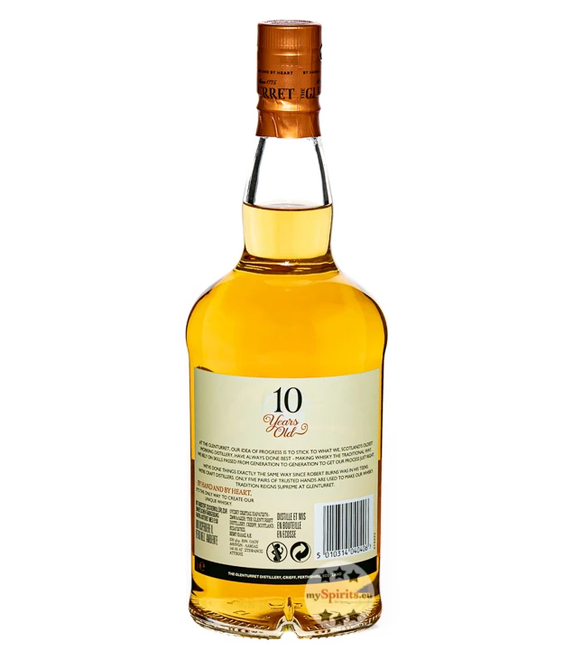 Schon im Namen der Brennerei ist ein essenzieller Bestandteil der Whiskyproduktion verewigt: der Loch Turret, der das benötigte Wasser führt. Das leicht rauchige Malz wird auf den hauseigenen Malzböden vorbereitet, die verwendete Gerste stammt aus Schottland. Je eine Wash- und Spiritstill kommen für die Produktion zum Einsatz, für das angenehme Mundgefühl von Glenturret 10 sorgt die Reflux-Schale in letzterer. Sie erhöht den Rückfluss und lässt so einen weniger spitzen oder scharfen Brand entstehen. Die zehnjährige Lagerung des Single Malt Scotch Whiskys findet in Bourbon- und Sherryfässern statt.