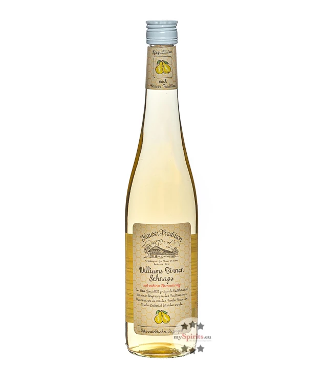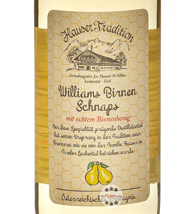 Hauser Traditions Schnaps und Edelbrände bestechen durch einmalig, hohe Qualität. Das Familienunternehmen stammt ursprünglich aus Tirol, wird jedoch mittlerweile seit über 30 Jahren in Vorarlberg weitergeführt. Die strengen Qualitätskontrollen und sorgfältig ausgewählten Zutaten sorgen für den gleichbleibenden erstklassigen Geschmack der Edelbrände und Schnäpse aus der Hauser Tradition. Der Williamsbirnen-Schnaps mit Honig überzeugt durch frische Williamsfrucht und feine Honig Noten im Geschmack.