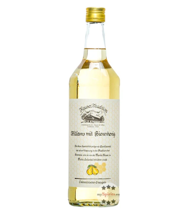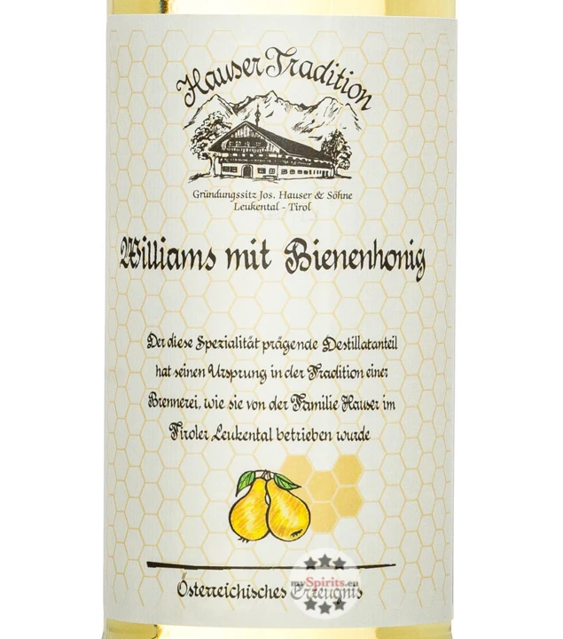 Feinstes Williams-Birnen-Destillat aus traditioneller Herstellung wird mit erlesenem Bienenhonig verfeinert, um diese mild-süßliche Schnaps-Spezialität herzustellen. Hauser Tradtion Williams mit Bienenhonig vereint einen typisch birnenfruchtigen Williams Schnaps sonnengereifter Früchte mit der feinen Würze und Süße des Bienenhonigs.