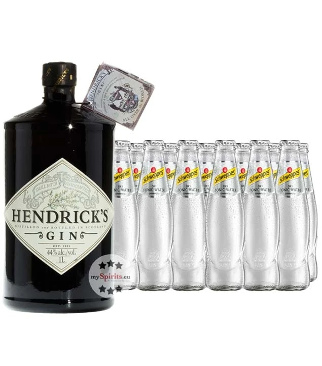 Das Set besteht aus einer 1,0 Liter-Flasche Hendrick’s Gin und zwölf 0,2 Liter-Flaschen Schweppes Dry Tonic Water.