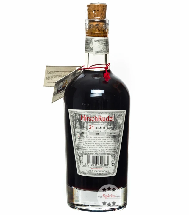 Wie so oft in der Welt erfolgreicher Produkte war es ein geerbtes Rezept, das wiederbelebt und zum Erfolg wurde. So liegt auch der Fall beim deutschen Kräuterlikör HirschRudel. Firmengründer Dirk Verpoorten entdeckte in einem verstaubten Reisekoffer auf dem Dachboden ein altes Rezept seiner Großmutter für einen Likör aus sage und schreibe 31 Wildkräutern. Oma Elly hatte sich als Jugendliche oft mit Wildkräutern beschäftigt und stellte das Rezept für HirschRudel zusammen. Die Zusammensetzung des tiefbraunen Likörs ist natürlich streng geheim, geschmacklich kommen aber Nuancen von Kaffee, Anis, Karamell und Schokolade zum Tragen. Auch Vanille, eine malzige Süße und geröstete Nüsse sind zu schmecken. Doch eines bleibt dominant bei HirschRudel: der unverkennbare Geschmack feinster heimischer Kräuter.