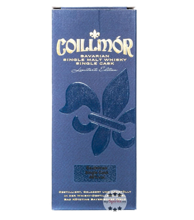 Der strohgoldene Whisky wird aus bestem, bayerischem Gerstenmalz destilliert. Hierbei kommt das Rau- und Feinbrandverfahren zum Einsatz, bei dem jedes Destillat zweifach destilliert wird und jeweils nur das Herzstück, also der qualitativ beste Teil des Destillats, weiterverwendet wird. Anschließend wird der Whisky in ehemaligen Sauternes-Fässern des Château d’Yquem gereift. Dieses weltberühmte Weingut nahe Bordeaux liegt in einer kleinen Ortschaft namens Sauternes und produziert vorwiegend die gleichnamigen edelsüßen Weine, die den Status als Premier Grand Cru Classé Supérieur genießen und zu den teuersten der Welt gehören. Ganze 5,5 Jahre reift Coillmor Sauternes Whisky in Fässern, die zuvor mit diesem Premium Wein befüllt waren.