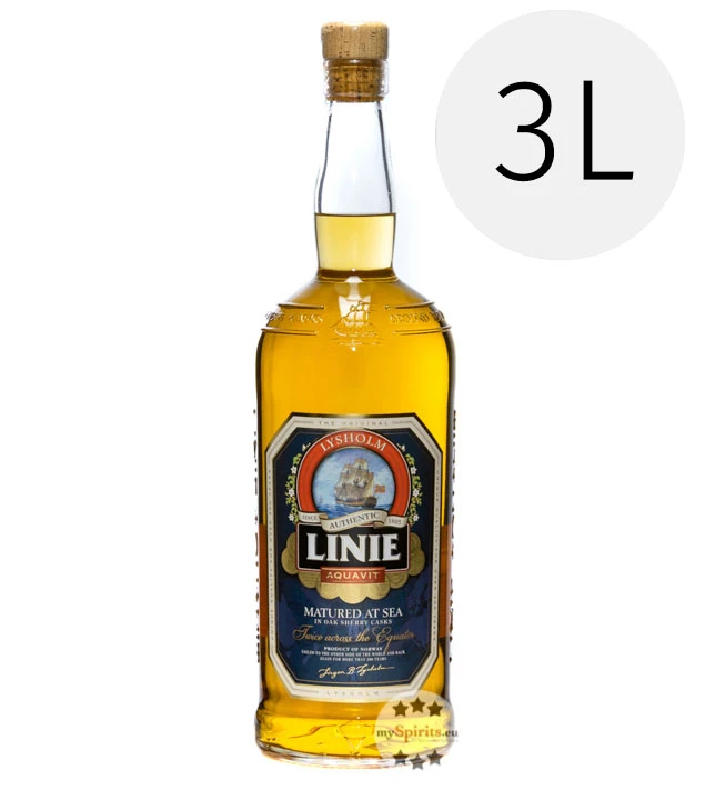 Wer die herausragende Qualität von Linie Aquavit kennt, wird wissen, dass eine übliche Flasche mit 0,7 oder 1,0 Liter Inhalt nicht lange hält. Deshalb gibt es die Linie Aquavit 3 Liter-Flasche! Wie auch seine kleineren Geschwister steht auch bei der Linie Aquavit Großflasche auf der Innenseite des Etiketts vermerkt, wann und auf welchem Schiff der Aquavit die Äquator-Linie überquert hat.