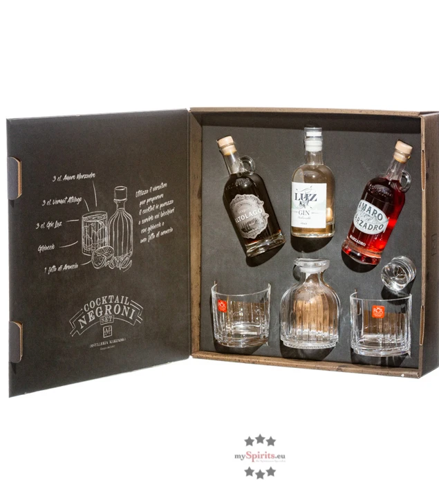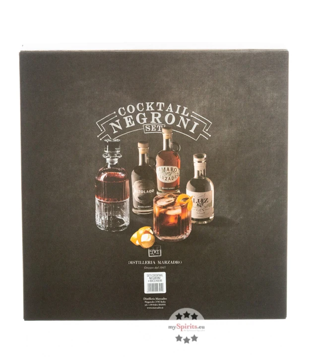Im hochwertigen Geschenk-Set „Negroni“ von Marzadro ist alles enthalten, was Sie für den typisch italienischen Aperitif-Cocktail Negroni brauchen. Es enthält eine 0,2 Liter-Flasche Marzadro Amaro, eine 0,2 Liter-Flasche Marzadro Gin Luz, eine 0,2 Liter-Flasche Marzadro Vermut Alto Lago, sowie eine wunderschöne Glas-Karaffe und zwei Tumbler Gläser. So steht Ihrem Feierabend-Cocktail nichts mehr im Wege.