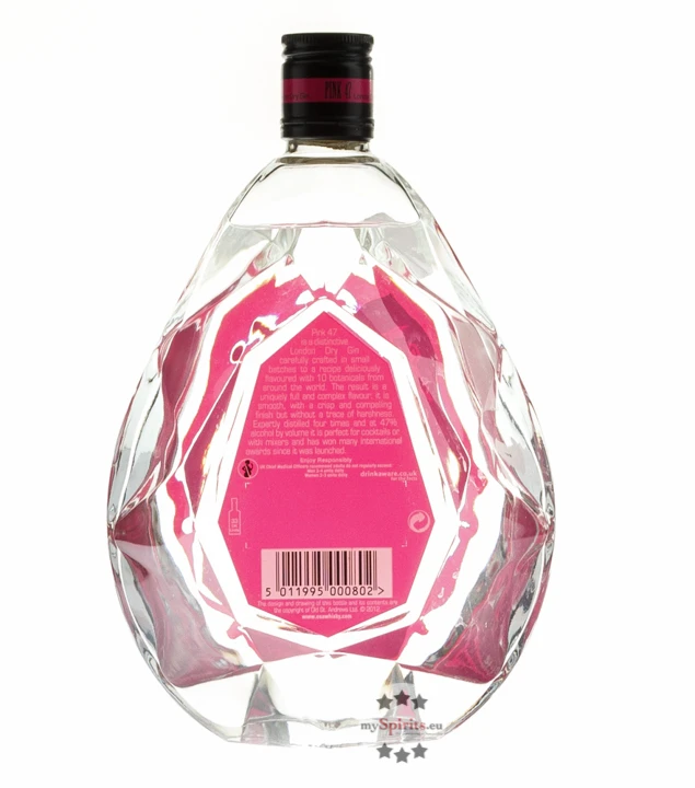 Mit dem für Gin perfekten Alkoholgehalt von 47 % Vol. im Namen und einer Flasche, die die Form eines Diamanten hat, beeindruckt Pink 47 Gin schon auf den ersten Blick. Doch auch der Inhalt kann überzeugen. Mit klassisch sattem Wacholder-Geschmack und schön umspielenden Nuancen von Zitrusfrüchten, Koriander, Muskat und orientalischen Gewürzen entfaltet sich Pink 47 Gin elegant und harmonisch am Gaumen und auf der Zunge.