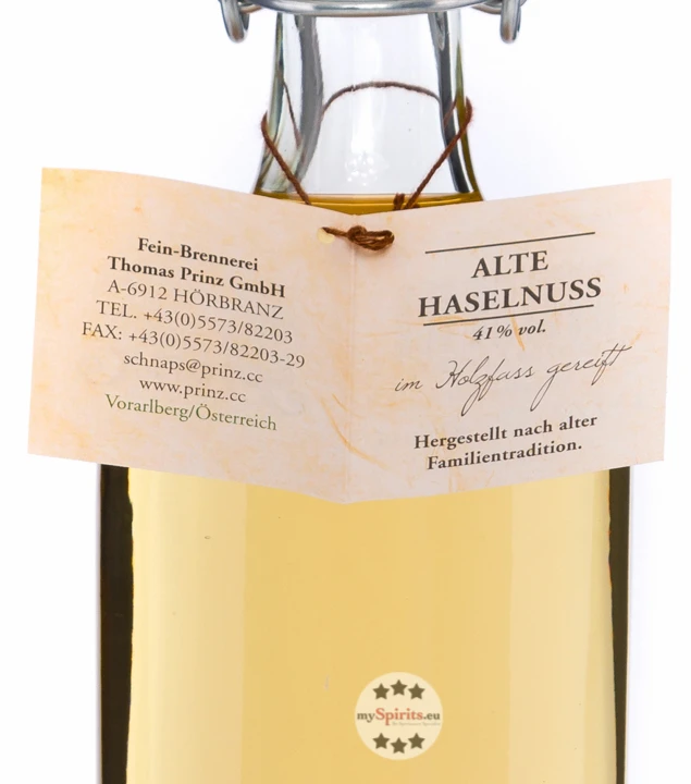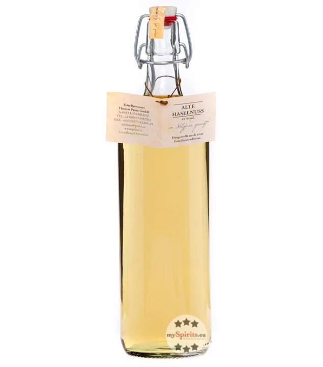 Die Destillation von Haselnüssen ist eine Kunst für sich. Die Feinbrennerei Prinz aus dem österreichischen Hörbranz am Bodensee verwendet für Alte Haselnuss, ihren Haselnussschnaps aus der Reihe der Alten Sorten, nur beste Haselnüsse und röstet sie in einem schonenden Verfahren, sodass sie auch später im Schnaps ihr volles Aroma entfalten. Modernste Brennerei-Technik stellt sicher, dass die üppige Geschmacksvielfalt der Haselnuss auch im Destillat erhalten bleibt. So wird aus in Alkohol eingelegten Haselnüssen ein Destillat hergestellt, das zunächst im Steingut und schließlich mehrere Monate lang im Holzfass gereift wird. Diese Reifung veredelt das Destillat und bringt in der Alten Haselnuss von Prinz einen intensiven, unverwechselbaren Haselnussgeschmack hervor.