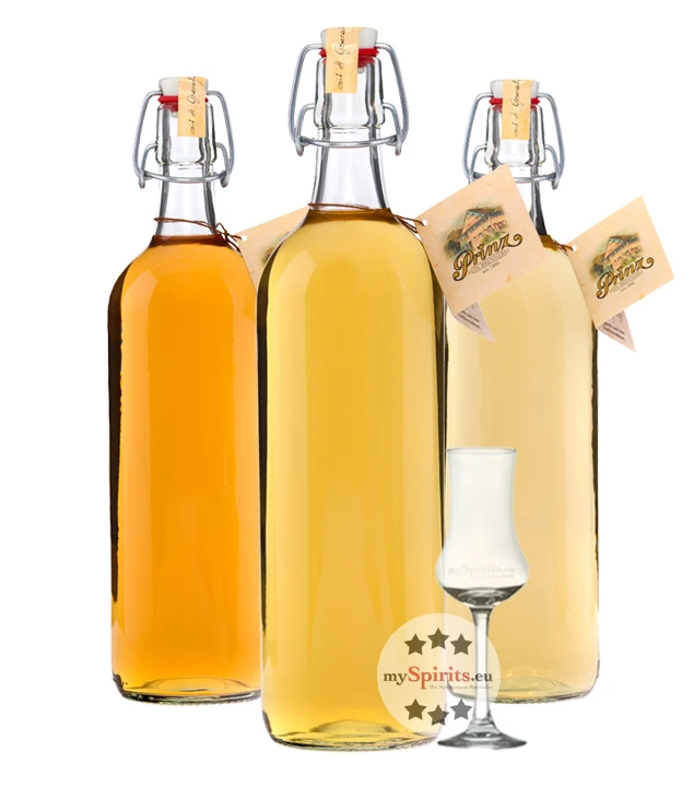 Das Set beinhaltet drei 1,0 Liter-Flaschen der beliebtesten Prinz Alten Sorten: Alte Marille, Alte Williams-Christ-Birne und Alte Waldhimbeere. Hinzu kommt ein mySpirits Schnapskelch, der sich hervorragend zur Verkostung dieser im Holzfass gereiften Spirituosen eignet.