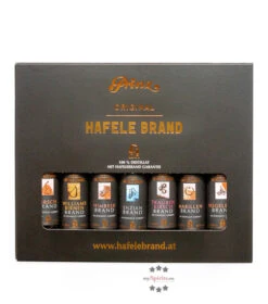 Schenken Sie die erstklassigen und besonders hochwertigen Obstbrände aus der Reihe „Hafele“ von der Feinbrennerei Thomas Prinz aus Hörbranz am Bodensee im Geschenkset zum Probieren „Die kleinen Hafele“. Darin enthalten sind hochwertige Edelobstbrände wie Prinz Marillenbrand, Prinz Traubenkirschbrand mit feinem Marzipan-Geschmack oder Prinz Williams-Birnen-Brand, jeweils in einer hübschen 0,04 Liter-Flasche zum Probieren. Alle sieben 4 cl-Miniatur-Fläschchen sind in einer schönen schwarzen Dekor-Schachtel verpackt und eignen sich damit ideal als hochwertiges Geschenk.