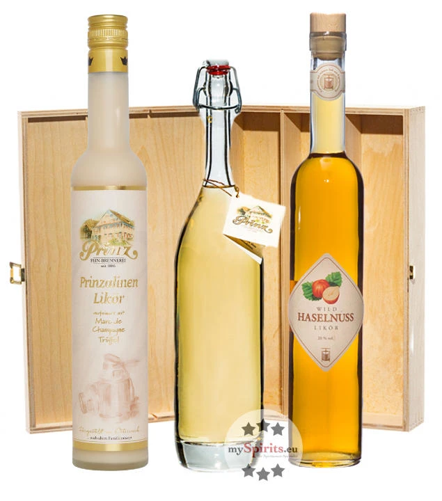 Das Geschenkset Naschkatze enthält zwei Liköre und einen alte Sorte der Fein-Brennerei Prinz. Dabei handelt es sich um eine 0,5 Liter-Flasche Prinzalinen-Likör Marc de Champagne Trüffel, eine 0,5 Liter-Flasche Wild-Haselnuss-Likör und eine 0,5 Liter-Flasche Alte Haselnuss. Verpackt sind die drei Flaschen in einer schönen Holzkiste. Das Geschenkset bietet so eine große Vielfalt an verschiedenen Geschmacksrichtungen und ist das ideale Geschenk für Naschkatzen, die gerne viel probieren.