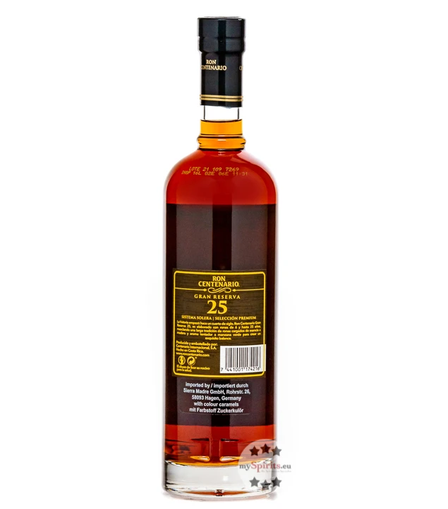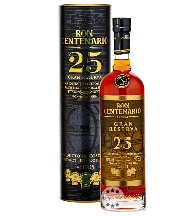 Das einzigartig saftig-süße Zuckerrohr, das auf den Ebenen Costa Ricas angebaut wird, ist Grundlage dieses Rums von Ron Centenario, der im Solera-Verfahren hergestellt wird. Während des sogenannten „Sistema Solera“ entsteht nach der 6- bis 25-jährigen Lagerung der erstklassigen Rums der Solera-Blend Centenario 25 Gran Reserva. Die zugrundeliegenden Eichenfässer werden pyramidenförmig so aufeinandergestapelt, dass die untersten die ältesten 25-jährigen Brände, die höheren Schichten immer jüngere beinhalten – bis hin zum 6 Años Rum an der Spitze. Der Blender füllt während des Prozesses eine bestimmte Menge der untersten – also ältesten – Fässer in die nächst jüngeren. Dies wiederholt er bis zur Spitze der Pyramide und vereint somit in dem oben aufliegenden Fass den Solera-Blend Rum mit dem Besten des Geschmacks der verschiedenen Rums.