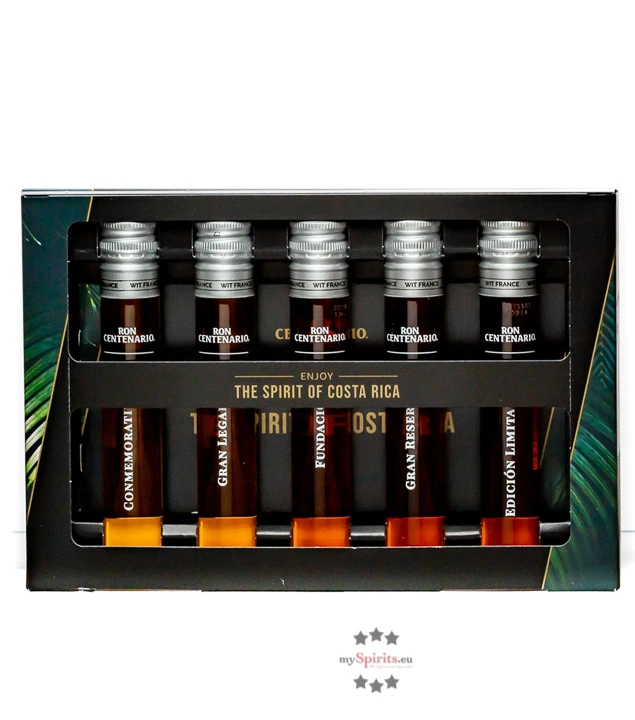 Karibisches Temperament und der bunte Charme Costa Ricas, eingefangen in einer Spirituose, die in Mittelamerika bei keiner geselligen Runde fehlen darf: Rum. Hinter dem Markennamen Centenario verstecken sich besonders edle Tropfen, die von Rum-Kennern und Genießern weltweit geschätzt werden. Durch die vielen Vulkane und das tropische Klima eignet sich Costa Rica hervorragend für den Anbau von Zuckerrohr. Centenario Rum wird in ausgesuchten Ex-Bourbonfässern gelagert, was den verschiedenen Varianten einen ganz eigenen und unverkennbaren Geschmack verleiht. Mit dem praktischen Tasting Set haben Sie die Möglichkeit, 5 Centenario Rums zu probieren und Ihren persönlichen Liebling auszuwählen.