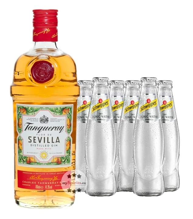 Das Set besteht aus einer Flasche Tanqueray Flor de Sevilla Gin und sechs Flaschen Schweppes Dry Tonic Water – das Dry Tonic ist im Vergleich zum Indian Tonic von Schweppes weniger süß und hat eine herbere Note.
