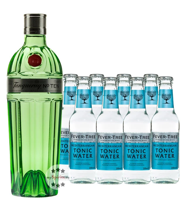 Sowohl der Gin als auch das Tonic Water dieses Gin Tonic Sets kommen aus England. Beim Gin handelt es sich um eine 0,7 Liter-Flasche Tanqueray No. Ten Gin und beim Tonic Water um acht Flaschen Fever-Tree Mediterranean Tonic Water mit jeweils 0,2 Litern Inhalt. Der vollmundige, komplexe Gin, hat eine besondere Milde. Botanicals wie Wacholder und frische Zitrustöne sind deutlich zu erkennen. Zusammen mit dem mediterranen Tonic Water von Fever-Tree, das durch eine für Tonic Water dezente Herbe und angenehme Süße überzeugt, entsteht ein leckerer Gin Tonic. Das Set ist für ein Mischverhältnis von 1:2 passend zusammengestellt.