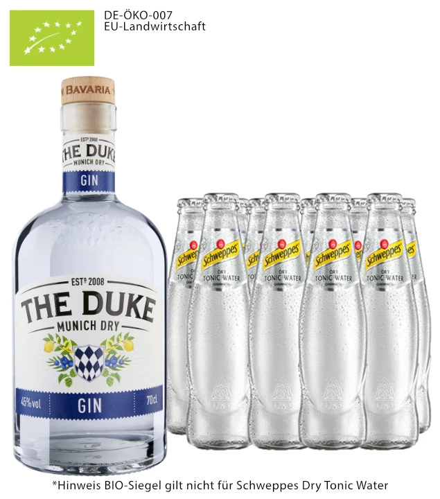 Das Set besteht aus einer 0,7 Liter-Flasche The Duke Gin und zehn 0,2 Liter-Flaschen Schweppes Dry Tonic Water. Eine Kombination, die im Gin Tonic besonders gut harmoniert.