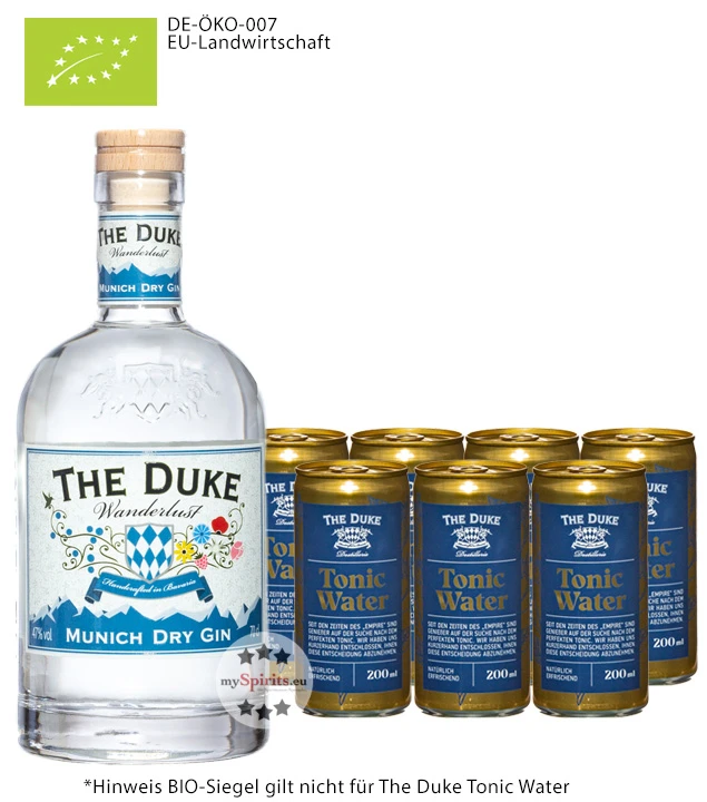 Harmonisch abgestimmt bietet das Set die perfekte Grundlage für einen leckeren Gin & Tonic. Die Münchner Destillerie The Duke hat eigens für ihre Gin-Kreationen ein Tonic Water auf den Markt gebracht. Im Set sind eine 0,7 Liter-Flasche The Duke Wanderlust Gin und sieben 0,2 Liter-Dosen The Duke Tonic Water enthalten. In einem Mischverhältnis von 1:2 steht einem Gin Tonic also nichts mehr im Weg.