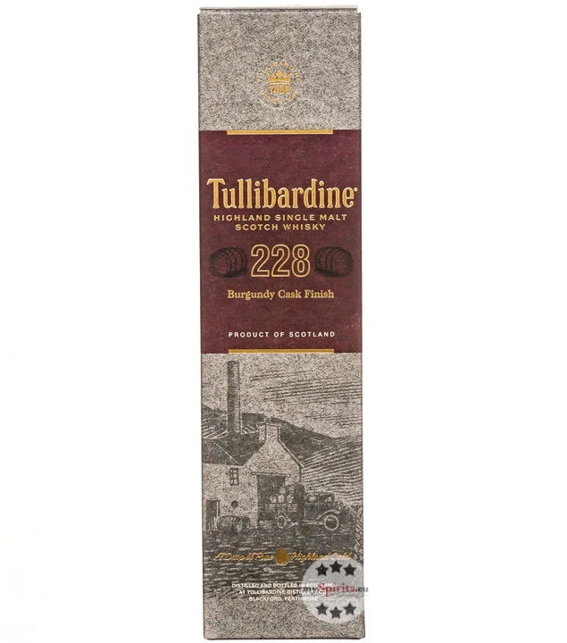 Die schottische Tullibardine Destillerie befindet sich in der Ortschaft Blackford in den südlichen Highlands. Das Gebäude beherbergte für einige Jahrhunderte eine Bierbrauerei und wurde im Jahr 1947 zur heutigen Brennerei umgebaut. Die junge Geschichte der Tullibardine Whiskys wie man sie heute kennt, beginnt allerdings erst um die Jahrtausendwende, als sie von der französischen Wein- und Spirituosengruppe Picard Vins & Spiritueux übernommen wurde. Das Portfolio wurde infolgedessen erneuert und einige neue Single Malts herausgebracht, so auch Tullibardine 228 Burgundy Finish.